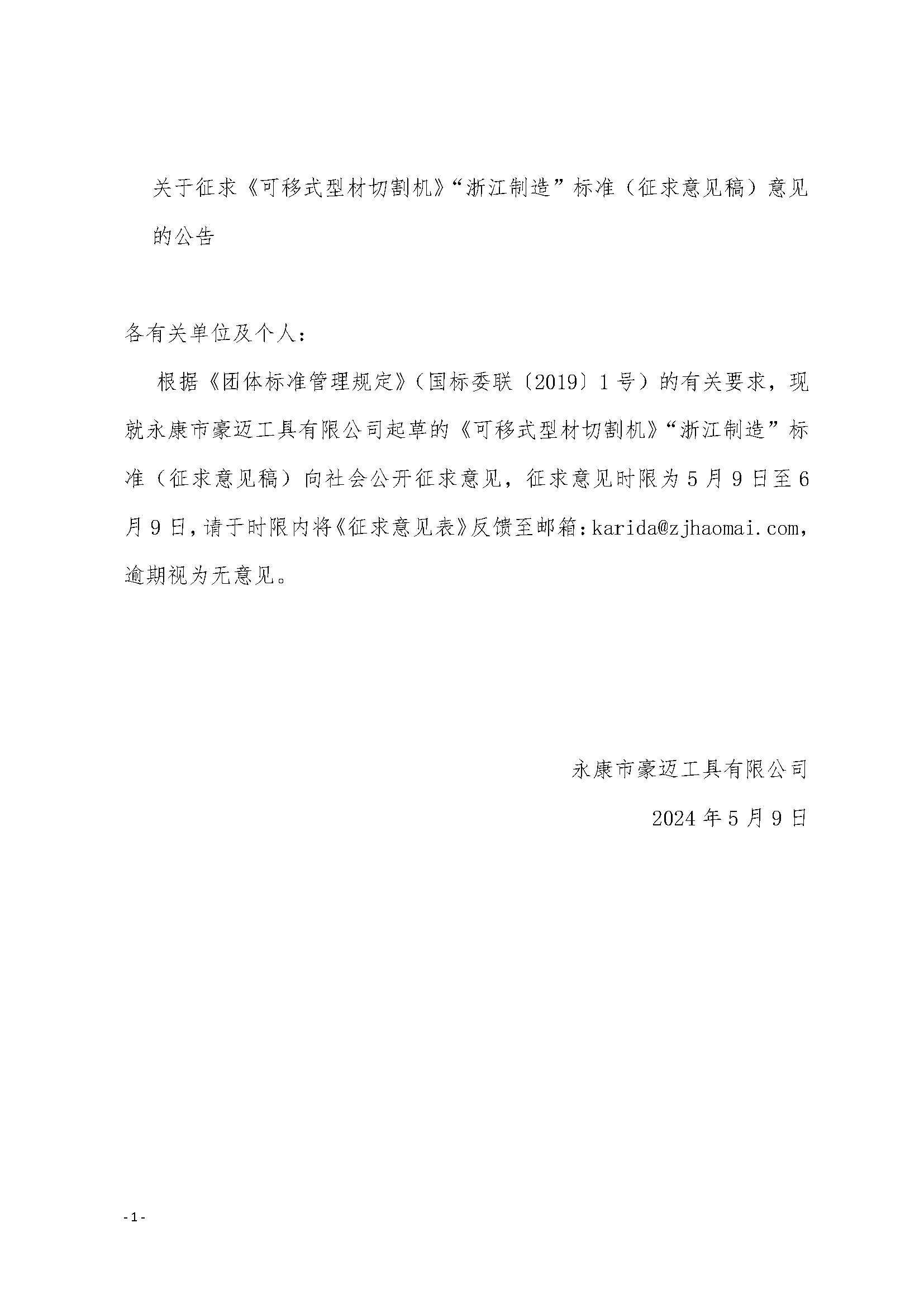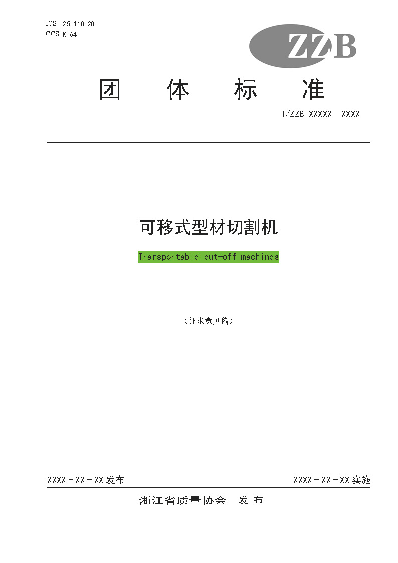 关于征求《可移式型材切割机》“浙江制造”标准(征求意见稿)意见的公告